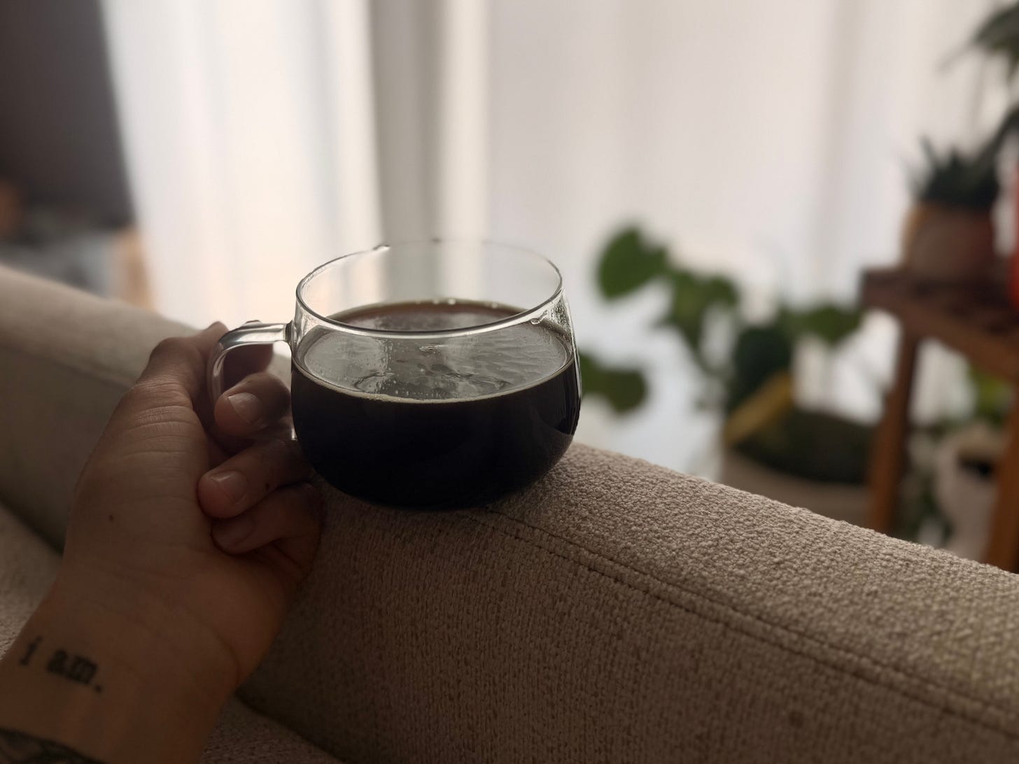 the soft light beaming behind the white curtain of my apartment living room.